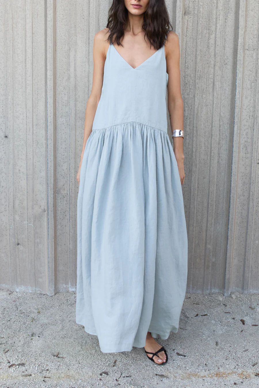 Easy elegance. 100% Irish linen from a multigenerational-family-run mill. Chic drop waist, dainty straps, lined bodice, and a full, voluminous skirt that epitomizes summer.