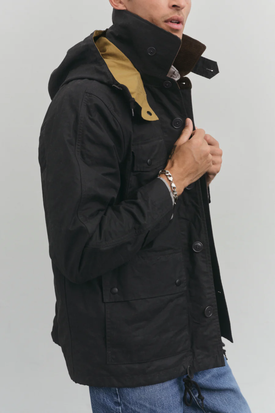 As utilitarian as it is good looking. Always Be Prepared meets Milanese street style. Waxed cotton field jacket with a removable hood and dual entry hip pockets. Corduroy collar. Water resistant fabric that develops an incredible patina over years of wear.Â