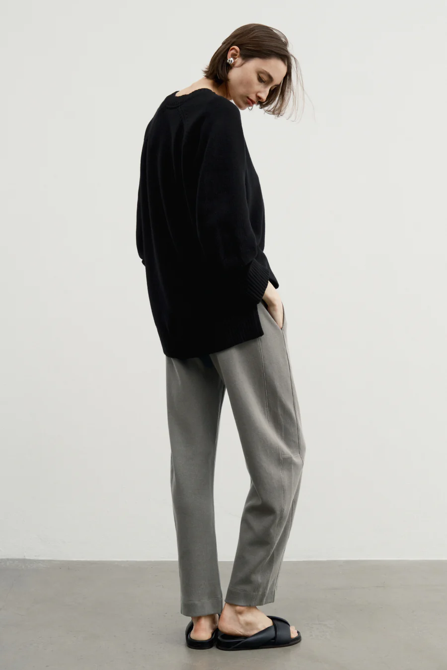A laidback pair of pull-on pants in a soft, sturdy 100% pima cotton brushed rib knit. Easy barrel leg with a flattering waistband construction that keeps the front body clean. Cozy jersey pockets, because, hello, obviously. You'll never take them off.